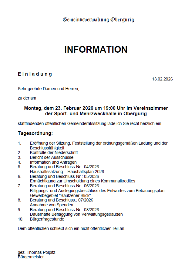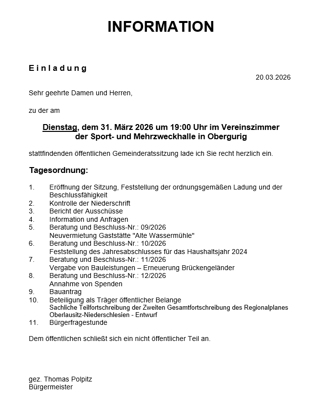 ich möchte Sie recht herzlich auf der Internetseite der Gemeinde Obergurig begrüßen. Unsere Gemeinde besteht aus 7 Ortsteilen sowie einer Ortslage und ist Heimat für ca. 2.100 Einwohner.